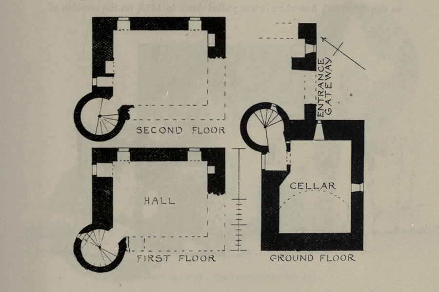 The first floor housed the great hall, lit by one window in the north-east wall overlooking the courtyard entrance and two in the south-east wall. Within the south-west wall of the hall is a small cupboard and on this wall there was once also a fireplace with carved jambs, one of which fell due to inclement weather in the winter of 1889-90. What has been interpreted as a doorway into the hall is located immediately to the east of the door from the stair tower and directly above the entrance at ground floor level, with only hints left due to the damage to the south-west walls. This would be a slightly strange arrangement so it’s tempting to speculate that it may actually have been a window seat.